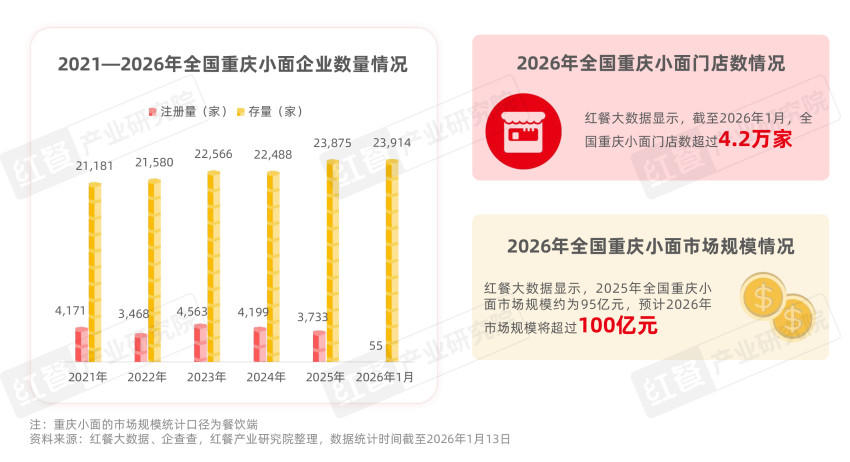據(jù)企查查數(shù)據(jù),截至2026年1月,全國重慶小面相關(guān)企業(yè)數(shù)量約2.4萬家,較2024年年底增長6.3%。門店數(shù)量方面,紅餐大數(shù)據(jù)顯示,截至2026年1月,全國重慶小面門店數(shù)超過4.2萬家,預(yù)計2026年重慶小面市場規(guī)模將有望突破百億元。