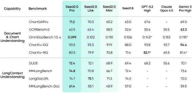 豆包2.0的多模態(tài)升級,明顯對準(zhǔn)生產(chǎn)環(huán)境輸入:截圖識別、復(fù)雜文檔解析、圖表理解與流程圖閱讀被重點優(yōu)化。在空間理解MMSIBench、運動理解MotionBench、視頻理解VideoMME等評測集中,其綜合表現(xiàn)已進(jìn)入第一梯隊;圖表理解CharXiv-RQ 能力亦明顯提升。