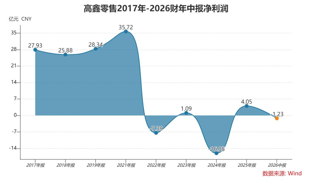 報(bào)告期內(nèi),高鑫零售實(shí)現(xiàn)營(yíng)收305.02億元,較同期的347.08億元下降約12.1%。公司期內(nèi)錄得虧損1.23億元,由盈轉(zhuǎn)虧。盡管高鑫在上一財(cái)年已艱難扭虧,但2026財(cái)年中報(bào)仍然虧損的數(shù)據(jù),表明其盈利能力尚未真正穩(wěn)固。