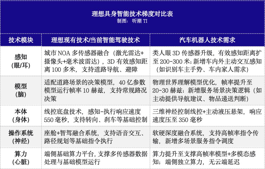 理想的具身智能也并非憑空而來,從汽車到汽車機器人,理想擁有一定的技術底座。通過梳理李想給出的五大技術模塊,聽潮TI整理了理想具身智能技術梯度對比表。