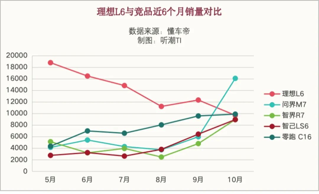 問界M7、智界R7、智己LS6等車型持續(xù)分流客戶,在L6銷量連月下跌時,多家競品車型一路上行,其中問界M7增程版10月銷量達16071輛,成為該區(qū)間銷量領頭羊,其他車型基本都在月銷8000-9000輛的范圍,與L6站在了同一水平線上。