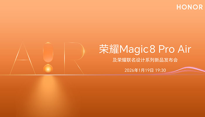 薄,是姿態(tài);強,是底氣。Air帶來的輕盈手感,Pro帶來的旗艦實力,這一次,全都給到你。1月19日19:30,榮耀Magic8 Pro Air及榮耀聯(lián)名設(shè)計系列新品發(fā)布會,不見不散!