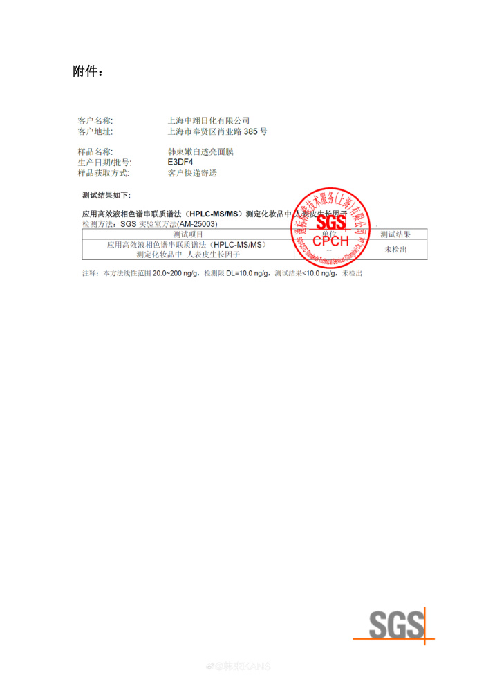 報(bào)道發(fā)生后,我們已立即啟動全面自查與追溯程序。早在2025年11月,上海市藥品監(jiān)督管理局稽查局已就該產(chǎn)品開展了現(xiàn)場核驗(yàn)與檢測,并基于客觀公允性進(jìn)行了雙向送檢,結(jié)果均顯示:送檢樣品中均未添加人表皮生長因子(EGF)成分。第三方專業(yè)機(jī)構(gòu)SGS的檢測報(bào)告詳見附件圖片。