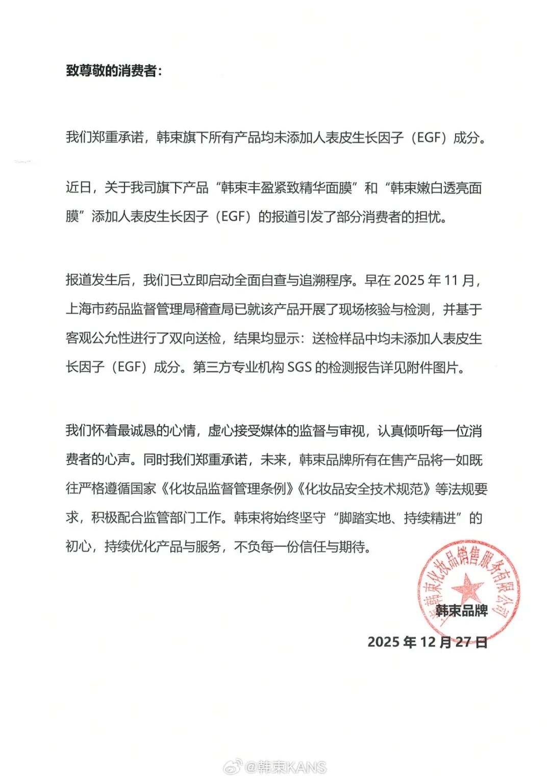 近日,關(guān)于我司旗下產(chǎn)品“韓束豐盈緊致精華面膜”和“韓束嫩白透亮面膜”添加人表皮生長因子(EGF)的報(bào)道引發(fā)了部分消費(fèi)者的擔(dān)憂。