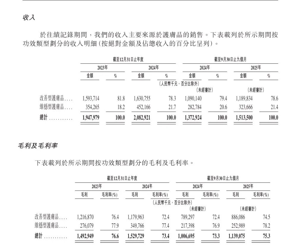 與此同時(shí),維穩(wěn)型護(hù)膚品占比也在穩(wěn)步提升,在2023年、2024年、2025年前九個(gè)月收入分別為3.54億元、4.52億元、3.24億元;毛利分別為2.76億元、3.50億元、2.53億元;毛利率分別為77.9%、77.4%、78.2%。