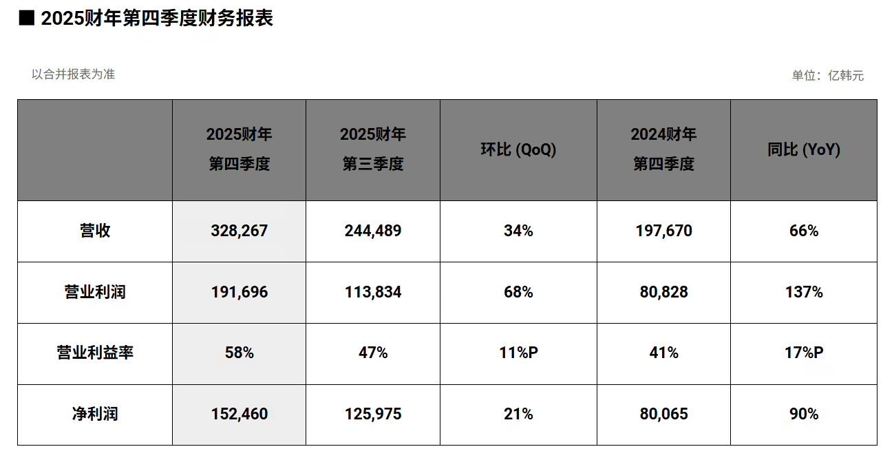SK 海力士 2025 財(cái)年第四季度營(yíng)收為 32.8267 萬(wàn)億韓元(現(xiàn)匯率約合 1579.62 億元人民幣),環(huán)比增長(zhǎng) 34%;營(yíng)業(yè)利潤(rùn)為 19.1696 萬(wàn)億韓元(現(xiàn)匯率約合 922.44 億元人民幣),環(huán)比增長(zhǎng) 68%;營(yíng)業(yè)利潤(rùn)率達(dá) 58%,三項(xiàng)指標(biāo)均刷新歷史紀(jì)錄。