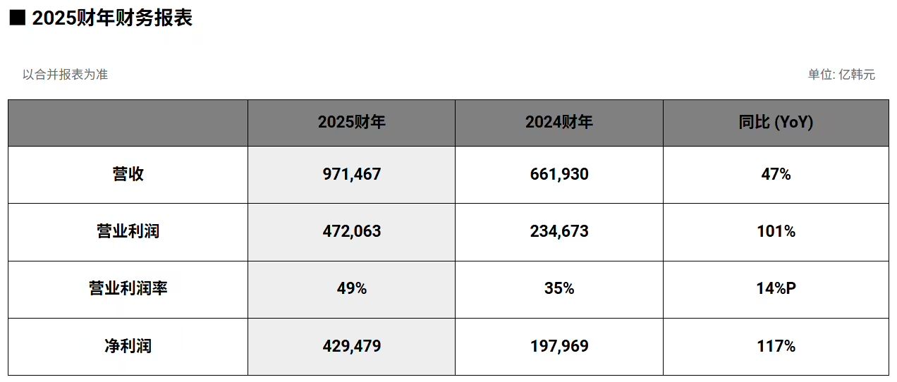 DoNews1月28日消息,SK 海力士今日發(fā)布截至 2025 年 12 月 31 日的 2025 財(cái)年及第四季度財(cái)務(wù)報(bào)告:2025 財(cái)年?duì)I業(yè)收入為 97.1467 萬(wàn)億韓元(現(xiàn)匯率約合 4674.7 億元人民幣),同比增長(zhǎng) 47%;營(yíng)業(yè)利潤(rùn)為 47.2063 萬(wàn)億韓元(現(xiàn)匯率約合 2271.57 億元人民幣,營(yíng)業(yè)利潤(rùn)率為 49%),同比增長(zhǎng) 101%。