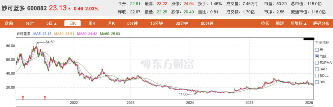 東方財富網(wǎng)數(shù)據(jù)顯示,妙可藍多股價自2021年沖上最高點之后便一路下行,截止1月29日,妙可藍多股價報收于23.13元/股,總市值118億元,不復(fù)往昔榮光。