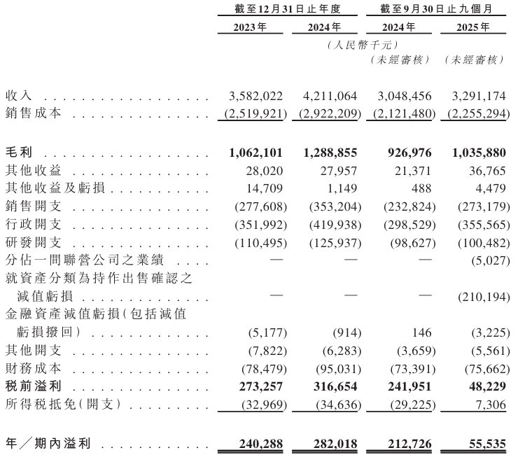 2023年、2024年及2025年截至9月30日止九個(gè)月,該公司收入分別約為35.82億元、42.11億元、32.91億元人民幣。2023年、2024年及2025年截至9月30日止九個(gè)月,該公司年╱期內(nèi)溢利分別約為2.40億元、2.82億元、5553.5萬(wàn)元人民幣。
