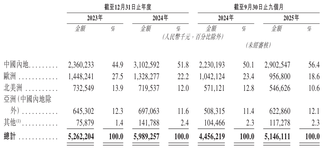從收入構成來看,舜宇智行2025年前9個月來自中國內地收入為29億元,占比為56.4%;來自歐洲收入為9.57億元,占比為18.6%;來自北美洲收入為5.47億元,占比為10.6%;來自亞洲(中國內地除外)收入為6.23億元,占比為12.1%;其他收入為1.17億元,占比為2.3%。