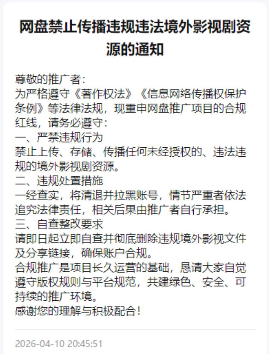 DoNews4月16日消息,據(jù) Vista 看天下報道,4 月 10 日起,網(wǎng)盤行業(yè)迎來針對海外影視資源史上最嚴清查??淇司W(wǎng)盤開始全面清查用戶存儲的海外影視內(nèi)容,涵蓋美劇、韓劇、泰劇等類型,大量公開分享鏈接一夜失效。
