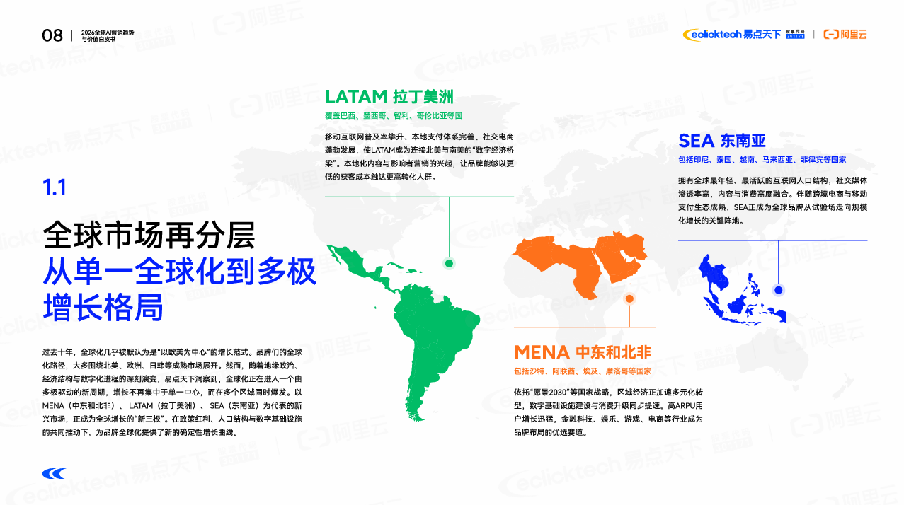 Aodi Zhang解讀道:“過去十年,全球營銷的敘事幾乎被規(guī)模主導(dǎo)——從算法競價到全域增長,從社交裂變到短視頻爆發(fā),企業(yè)們以 ROI 為坐標,持續(xù)追逐那條更快、更陡的增長曲線。然而,當(dāng) AI 技術(shù)與全球化進程同時抵達新的臨界點,這套以流量驅(qū)動的增長邏輯正在被重寫?!痹凇栋灼分?,易點天下和共創(chuàng)伙伴們將這一趨勢總結(jié)為:全球營銷正在從全球化(Globalization)邁向智能全球化(Intelligent Globalization)”。
