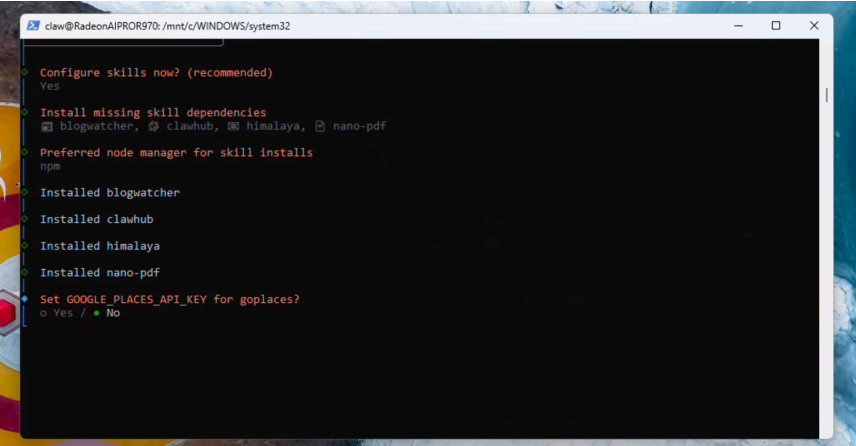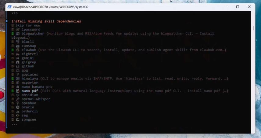 現(xiàn)在我們將選擇一些初始功能:himalaya、blogwatcher、nanopdf和clawhub(如果在列表中找不到clawhub也別擔(dān)心——可以稍后再配置)。如果系統(tǒng)提示,請(qǐng)選擇npm并繼續(xù)安裝。