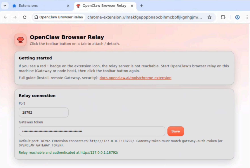 隨后會(huì)出現(xiàn)一個(gè)頁面,要求輸入Token。請(qǐng)輸入該Token 并點(diǎn)擊 Save(保存)。如果配置成功,頁面會(huì)顯示 “Relay reachable and authenticated(中繼已連接并完成認(rèn)證)“。