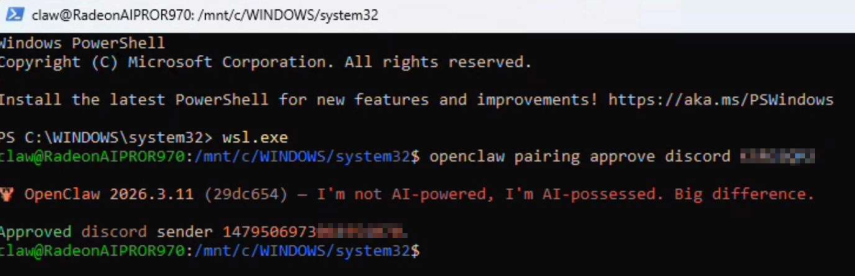 要完成Discord配對(duì),只需向你的機(jī)器人發(fā)送私信,它就會(huì)回復(fù)一個(gè)配對(duì)代碼以及在已激活WSL的PowerShell 窗口中粘貼的完整命令: