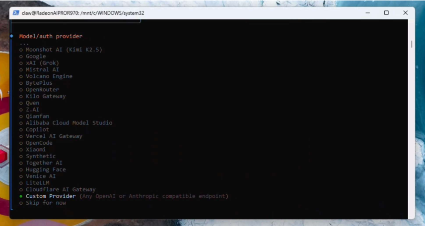 按向下箭頭鍵滾動(dòng)至“Custom Provider自定義提供商",然后按回車鍵確認(rèn)。