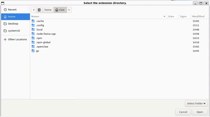 按Ctrl + H以顯示以點(diǎn)(.)開頭的隱藏目錄,然后點(diǎn)擊 .openclaw → browser → chrome extension,進(jìn)入該文件夾后點(diǎn)擊 Open(打開)。