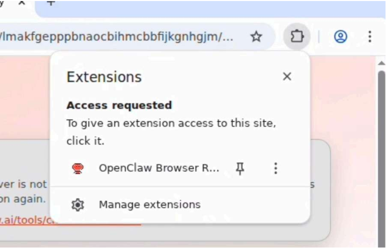 點(diǎn)擊工具欄中的擴(kuò)展程序圖標(biāo)(拼圖形狀),然后點(diǎn)擊 OpenClaw Browser Relay 將其開啟。開啟后,您將看到提示信息:“OpenClaw Browser Relay started debugging this browser(OpenClaw Browser Relay 已開始調(diào)試該瀏覽器)。“